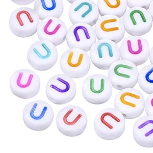 Pandahall 200Pcs White Flat Round Letter Beads Letter U Alphabet Acrylic Beads Double Sides 7×3.5~4mm Rainbow Color for Name Jewelry Making, Hole: 1.2mm.