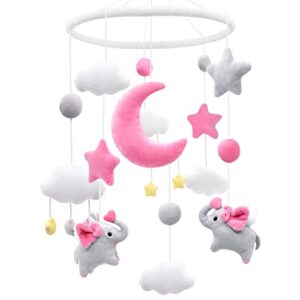 Pink Elephant Baby Girl Crib Mobile Pink and Gray Nursery Moon Stars Clouds Baby Mobile No Holder Pink Cot Mobile Soft Hanging Plush Toys