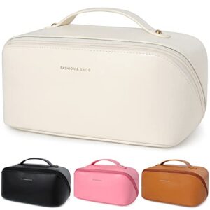 Portable Makeup Bag Opens Flat for Easy Access,Large Capacity Travel Makeup Bag for Women,PU Leather Travel Makeup Bag,Toiletry Bag for Cosmetics,Toiletries,Pencils and Daily Use (A-White)