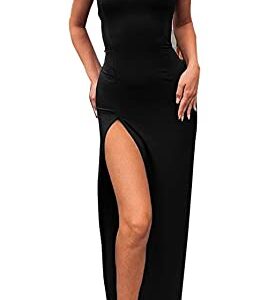 PRIMODA Women Spaghetti Strap Backless Thigh-high Slit Bodycon Maxi Long Dress Club Party Dress