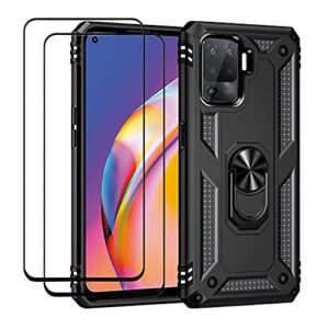 QCMM Compatible for Oppo Reno 5 Lite/Oppo A94 4G / Oppo F19 Pro Kickstand Case with Screen Protector Tempered Glass [2 Pieces], Hybrid Heavy Duty Armor Dual Layer Anti-Scratch Case Cover, Black