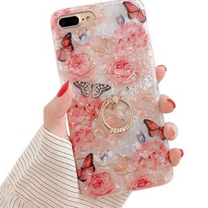 Qokey for iPhone 8 Plus Case,iPhone 7 Plus Case 5.5 inch Flower Cute Stand Cover for Women Girls 360 Degree Rotating Ring Stand Kickstand Soft TPU Shockproof Rose Butterfly