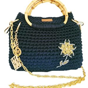 Rare Knitted Handmade Women Bag | Medium Crochet Women Bag | Crossbody Shoulder Bag | Black Casual Lady Purse | Crossbody Chain Zipper Bag | Fashion Luxury Bamboo Handle Bag | Accessory Women Gift