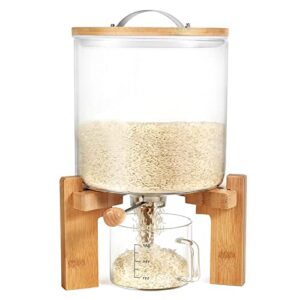 Rice Dispenser – Cereal Dry Food Storage Container Food Dispenser Countertop, Creative Glass Food Storage Container for Kitchen Organization and Pantry Store, Airtight Lid and Wooden Stand(5L)
