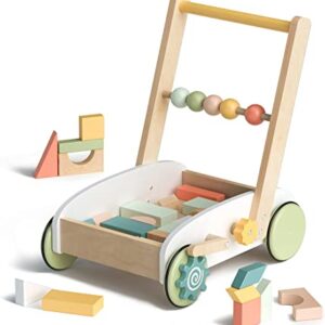 ROBUD Wooden Baby Push Walker, Baby Learning Walking Toys, 1st Birthday 1 2 3 Year Old Boys Girls Gifts, with Wooden Building Block