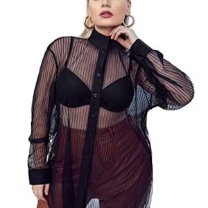 Romwe Women Plus Sheer Mesh Long Sleeve Button Shirts See Through Blouses