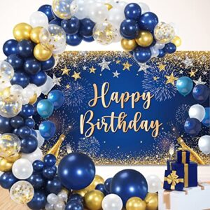 Rubfac Navy Blue Birthday Decorations 120pcs Navy Blue and Gold Balloon Garland with Happy Birthday Backdrop Banner Birthday Photo Backdrop Background for Birthday Party Decoration Supplies