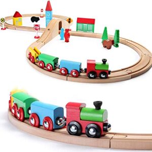 SainSmart Jr. Wooden Train Set for Toddler with Double-Side Train Tracks Fits Brio, Thomas, Melissa and Doug, Kids Wood Toy Train for 3,4,5 Year old Boys and Girls