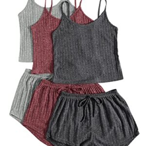 SheIn Women 3 Sets Rib Knit Lounge Set Crop Cami Top and Tie Front Shorts Sleepwear Pajama Set