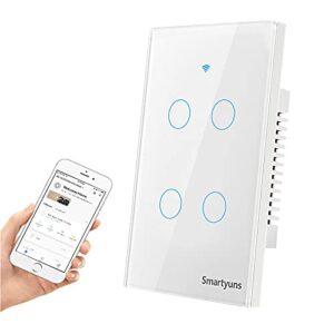 Smartyuns WiFi Smart Light Switch White, Modern Tempered Glass Panel Wall Touch Switch US Standard Single Pole Switches Works with Alexa, Google Assistant,”SmartLife” APP(4 Gang Light Switch White)