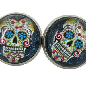 Stainless Steel Black Sugar Skull Printed Glass Stud Earrings 12mm