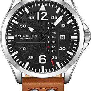 Stuhrling Original Mens Leather Watch -Aviation Watch, Quick-Set Day-Date, Leather Band with Steel Rivets, Men Watch Collection