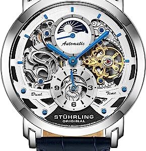 Stührling Original Mens Watch Stainless Steel Automatic, Skeleton Dial, Dual Time, AM/PM Sun Moon,Genuine Leather Strap 371 Watches for Men Series