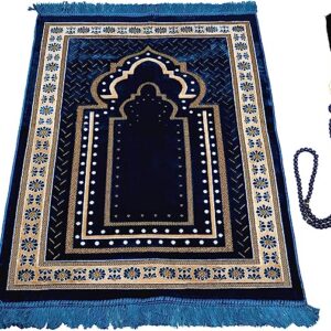 TB Muslim Prayer Rug Thick, Islamic, Soft Velvet Mat Ramadan Gift, with Prayer Bead Unique Decoration Gilded Gold-Like Embroidered for Women Man Kids Meditation Turkish African (Blue)