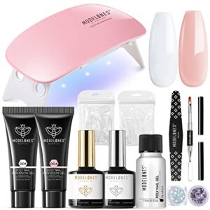 Modelones Poly Extension Gel Nail Kit 2PCS Builder Extension Gel Nude White Colors with Mini Nail Lamp Slip Solution Rhinestone Nail Manicure All-in-one Kit French DIY Nail Art Design Beginner Kit