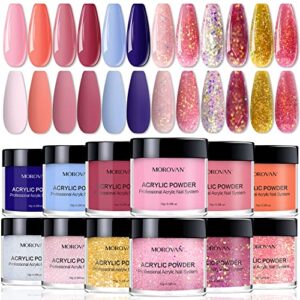 Morovan Acrylic Powder Set – 12 Colors Acrylic Nail Powder Pure Color and Glitter Professional Polymer Colored Acrylic Nail Powder for Acrylic Nail Extension Carving
