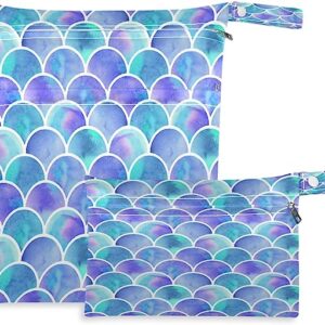 AUUXVA Wet Dry Bags Set Blue Purple Mermaid Scale,Cloth Diaper Wet Bag Waterproof Reusable with Two Zippered Pockets for Travel Beach Pool Swimsuits Wet Clothes,2pcs