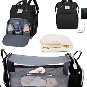 Diaper Bag Backpack with Auto Folding Crib, Portable 3 in 1 Diaper Bag Backpack,Large Capacity Waterproof Backpack with USB Port,Used for Father,Mother and Baby (Black)