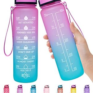 Elvira 32oz Motivational Fitness Sports Water Bottle with Time Marker & Removable Strainer,Fast Flow,Flip Top Leakproof Durable BPA Free Non-Toxic