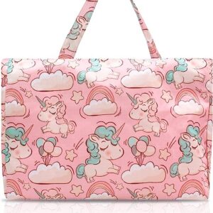 Finex Pink Unicorns and Rainbow Waterproof PVC Rectangular Hand Carry Diaper Bag Tote with Multiple Dividers Open Pockets Handles Zipper Closure