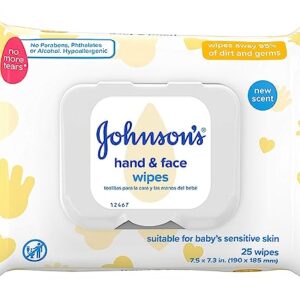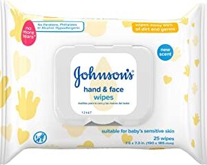 Johnson’s Baby Hand & Face Cleansing Wipes to Remove 95% of Germs and Dirt from Skin, Pre-Moistened Allergy-Tested Wipes, Formula, Paraben- and Alcohol-Free, 25 ct