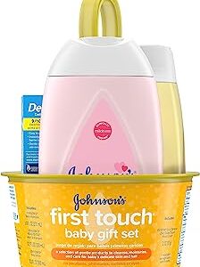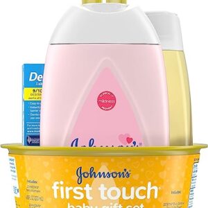 Johnson’s First Touch Baby Gift Set, Baby Bath, Skin, & Hair Essential Products, Kit for New Parents with Wash, Shampoo, Lotion, & Diaper Rash Cream, Hypoallergenic & Paraben-Free, 5 Items