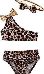 Kids Baby Girls 3pcs Leopard One Shoulder Vest Panties Bowknot Bikini Set Swimsuit Bathing Suit