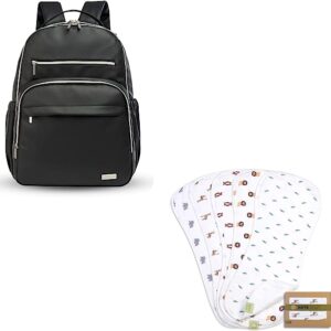 Large Waterproof Diaper Bag Backpack And 5-Pack Organic Muslin Baby Burp Cloths Bundle – Vegan Leather, Stylish, Multifunctional Baby Diaper Bags – Burp Rags – Neutral Burp Clothes for Baby Girl, Boy,