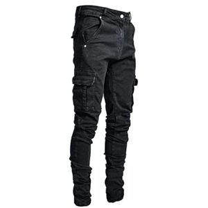 Men Side Pocket Pencil Jeans Skinny Casual Hip Hop Denim Pants Angled Cargo Pockets Jean Trousers Joggers Black