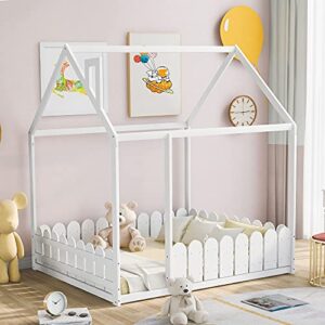 Merax Wooden House Bed with Fence-Shaped Guardrail Montessori Bed Frame for Kids, Toddlers, Girls, Boys (Full,White)