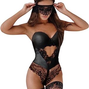 MEOILCE Bridal Lingerie for Women Sexy Naughty Faux Leather Kawaii Lace Boudoir Teddy Lingerie Bodysuit