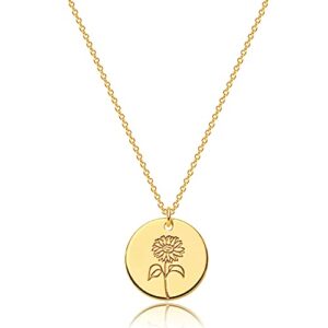 Mevecco Birth Flower Necklace 18k Gold Engraved Custom Floral Pendant Necklaces Dainty Birth Month Flower Disc Charm Hand Stamped Flower Disk Necklace Personalized Jewelry Birthday Gift for Her