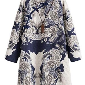 Minibee Women Linen Dress Long Sleeve Retro Tunic Dresses Ethnic Floral Print Clothing