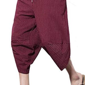 MIZOK Men Striped Harem Capris Casual Wide Leg Baggy Linen Cotton Pants with Elastic